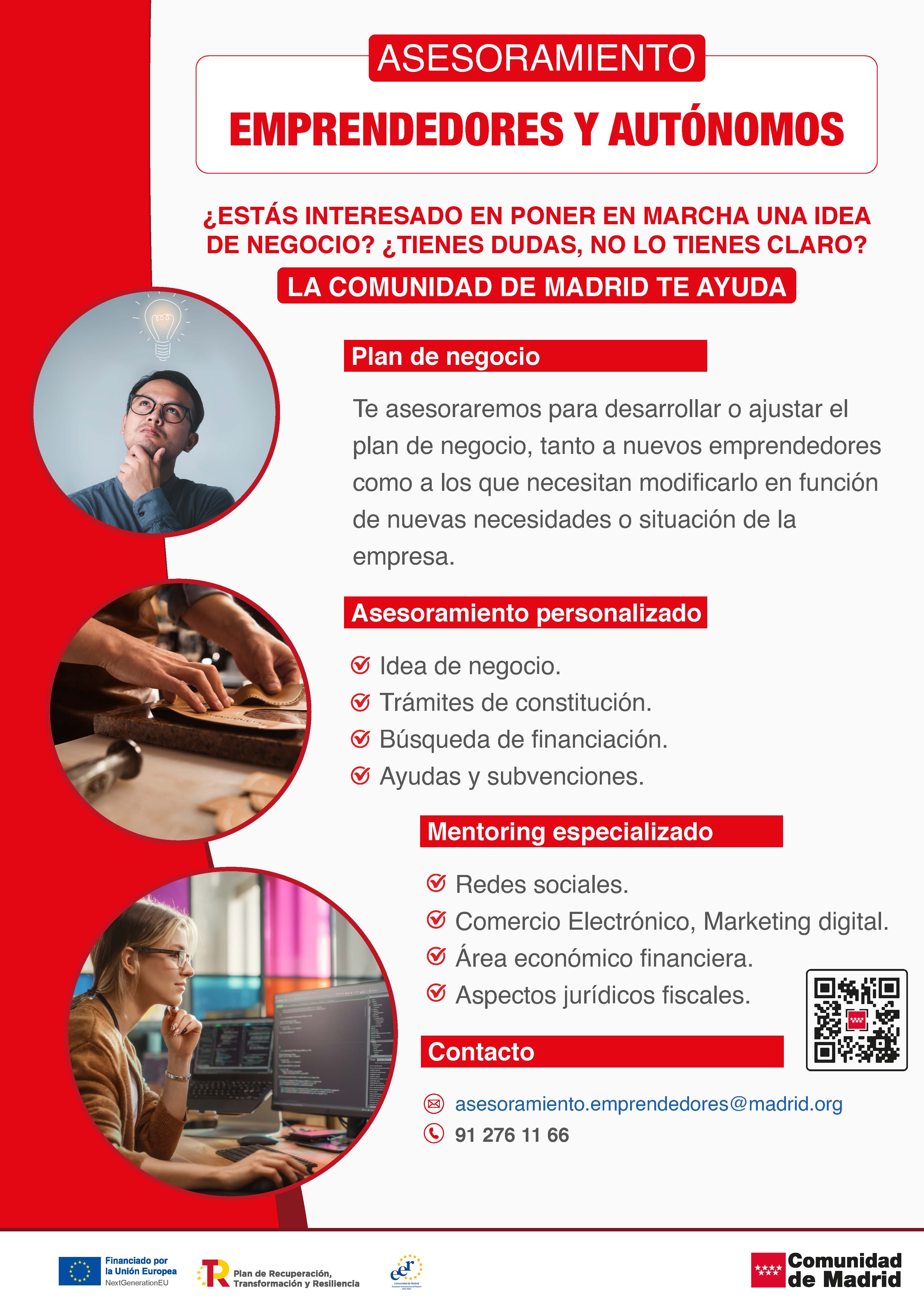 Los emprendedores y autónomos que requieran orientación personalizada sobre cuestiones relacionadas con la idea de negocio, trámites de constitución de la empresa, búsqueda de financiación o ayudas y subvenciones pueden contactar de lunes a viernes, de 9.00 a 14.00 h., con el teléfono 91 276 11 66 o mediante correo electrónico (asesoramiento.emprendedores@madrid.org). La Comunidad de Madrid también ofrece a las empresas un servicio de mentoring para impulsar el desarrollo empresarial con herramientas como las redes sociales o el marketing digital.