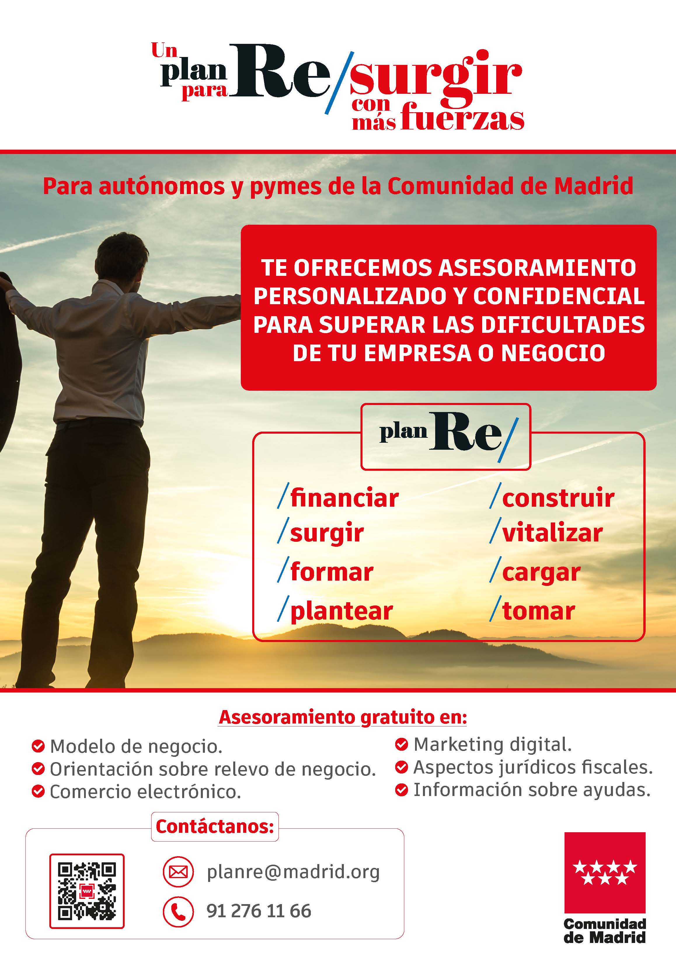 Por su parte, la finalidad del Plan Re es ofrecer asesoramiento gratuito, personalizado y confidencial a Pymes y profesionales autónomos para que puedan superar fases críticas en el desarrollo de su empresa. En este programa encontrarán asesoramiento especializado sobre aspectos financieros, legales o comerciales, entre otros. Para obtener más información o solicitar la participación en este programa es preciso contactar por correo electrónico (planre@madrid.org) o en el teléfono 91 276 11 66.