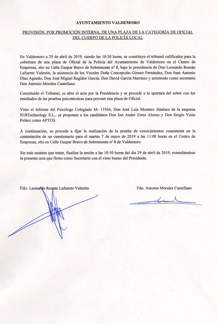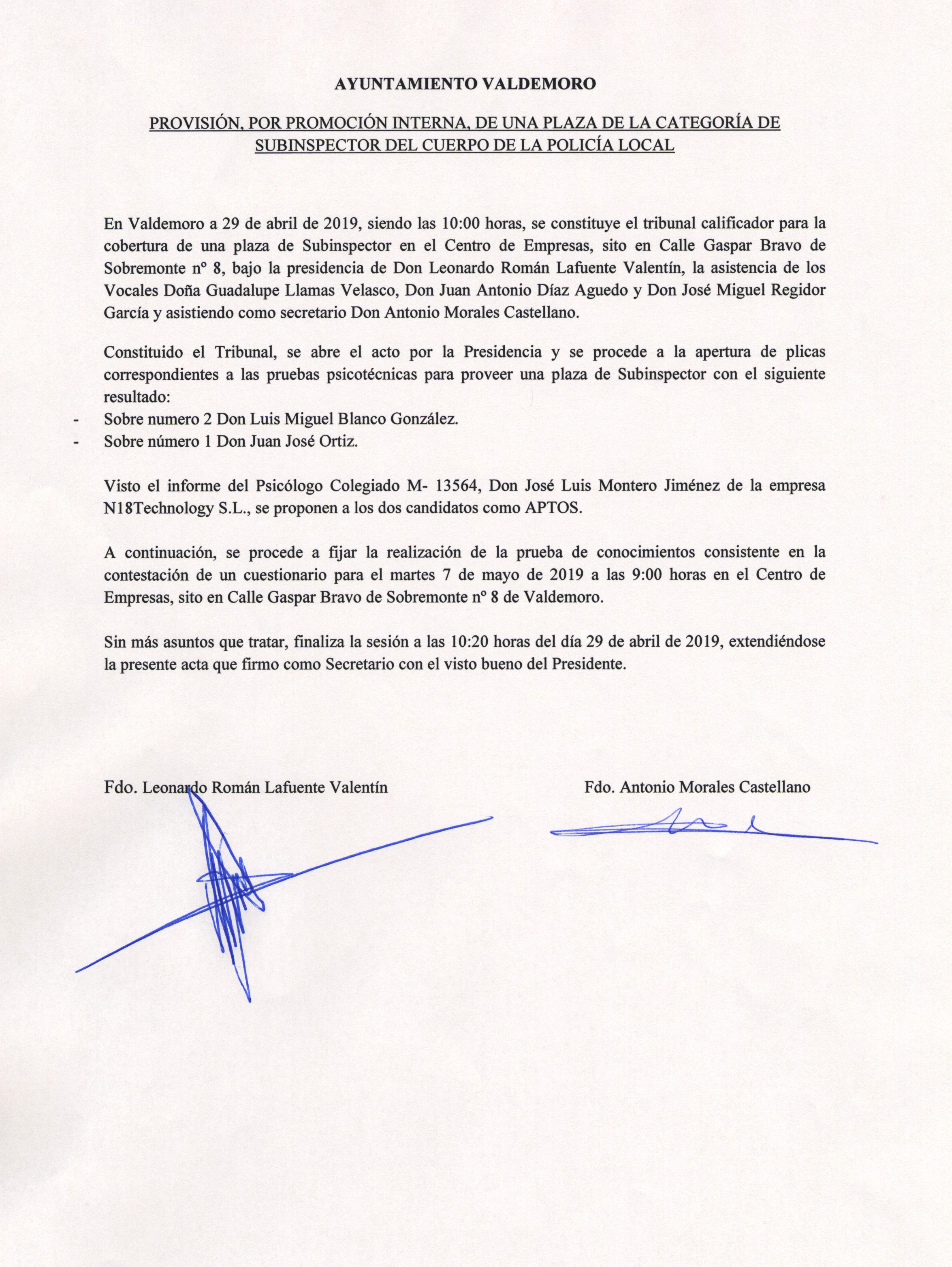 Acta del tribunal para la selección de una plaza de subinspector del cuerpo de policía del ayuntamiento de Valdemoro