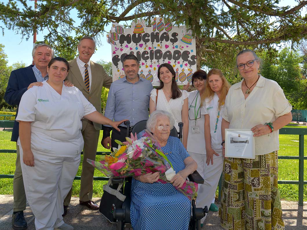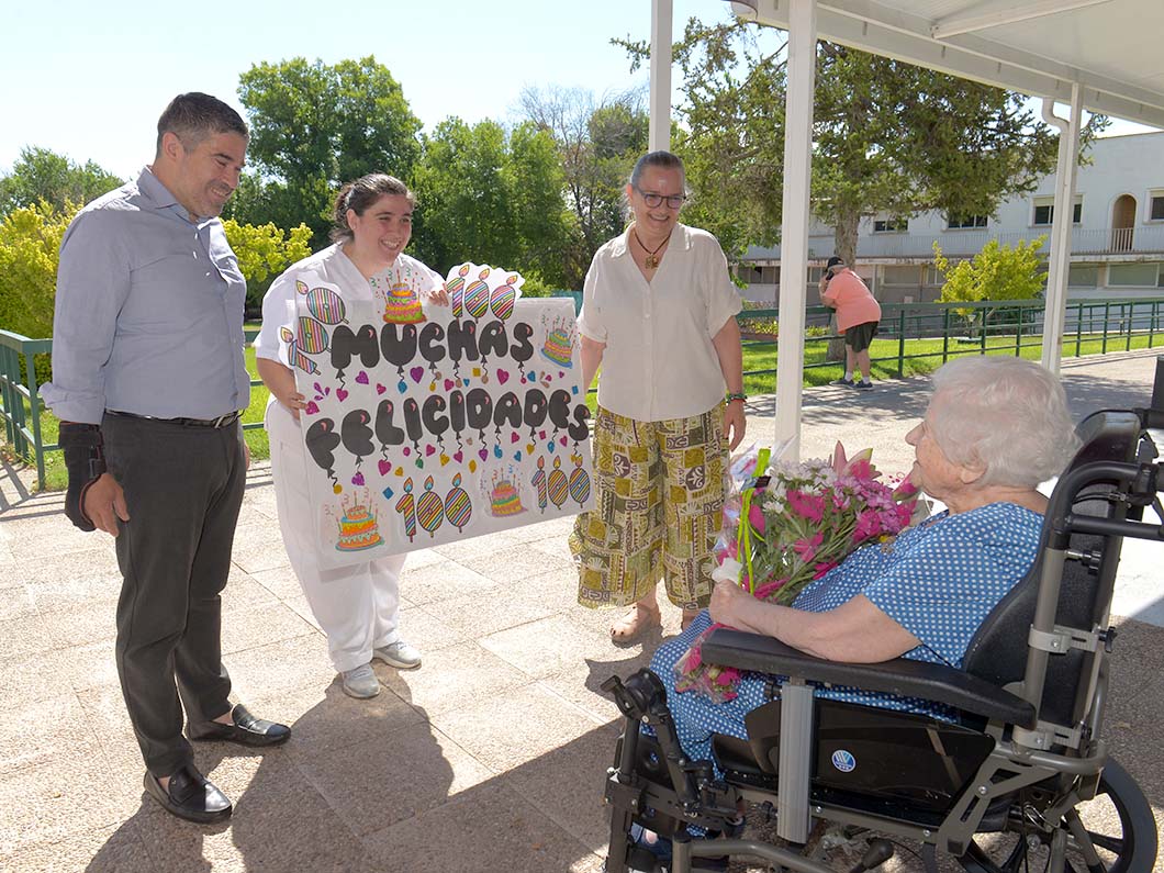 Profesionales de Casablanca, compañeros, amistades y familiares, además del primer edil y la concejala de Mayores, Mª José Fernández, se han sumado a este homenaje a María por haber alcanzado el siglo de vida, un festejo en el que recibió un ramo de flores y un recuerdo institucional consistente en un cuadro con un texto de felicitación e ilustrado con una imagen de la plaza de la Constitución hace un siglo.