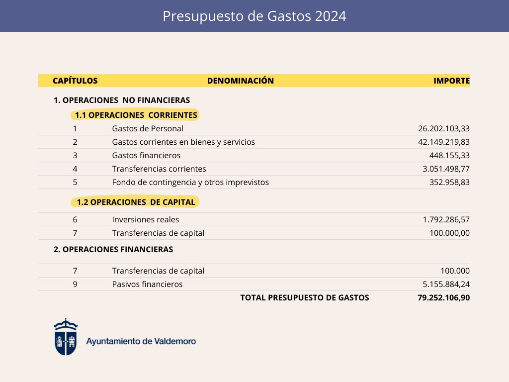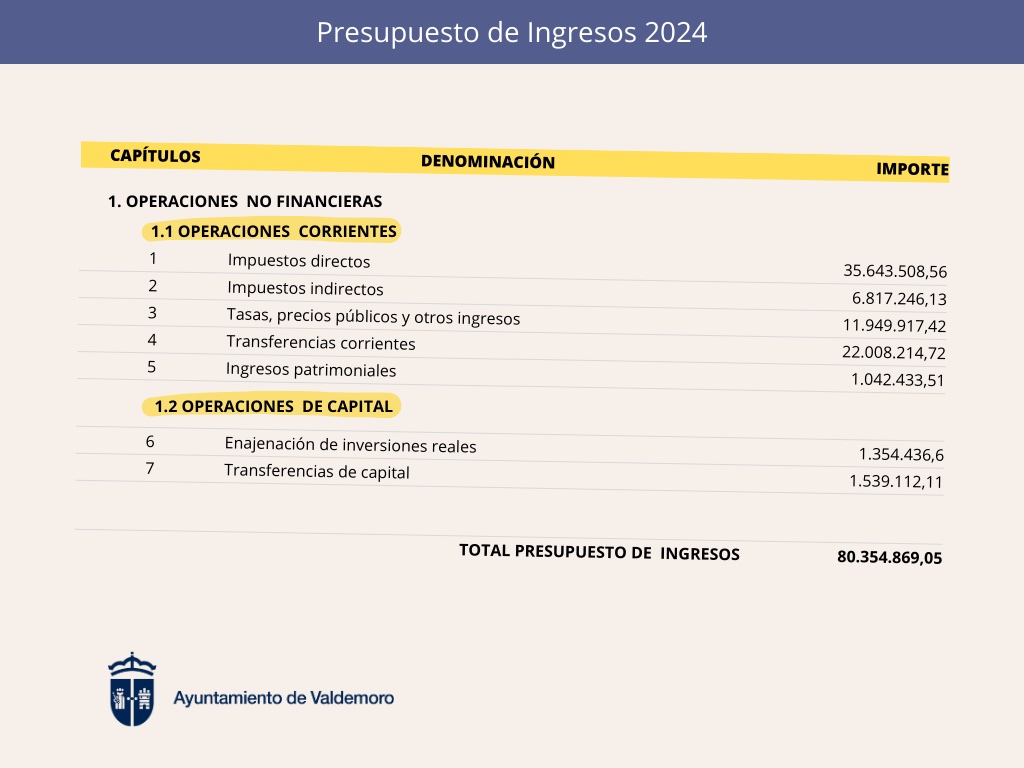 El Gobierno Municipal de Valdemoro ha llevado al Pleno la aprobación del Presupuesto Municipal para 2024. El documento sometido a votación asciende a 80.354.869,05 euros en el capítulo de ingresos y a 79.252.106,90 euros en el de gastos, en el que figuran incluidas las partidas que el Ayuntamiento aporta a los algo más de 8 millones que se destinarán a inversiones, principalmente a asfaltado, mejora de instalaciones deportivas, equipamiento para seguridad, emergencias y avance en la Administración Digital, incluidas cámaras para vigilancia de entradas y salidas al municipio y áreas industriales.