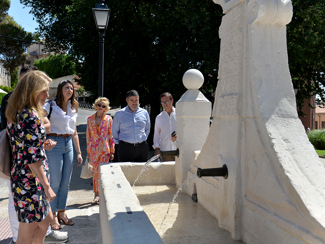 El alcalde, David Conde, acompañado de los concejales Juan Carlos Vicente, Rosa Amelia González, Mauricio Fernández y Lidia Vidal ha visitado esta mañana la Fuente de la Villa, por la que ya fluye de nuevo el agua, tras haber sido sometida, a lo largo de casi dos meses, a un proceso de restauración encaminado a preservar su valor histórico y recuperar el valor estético de este monumento emblemático de Valdemoro, construido en 1605, que será escenario de un concierto barroco el lunes 22 de julio, con entrada libre.