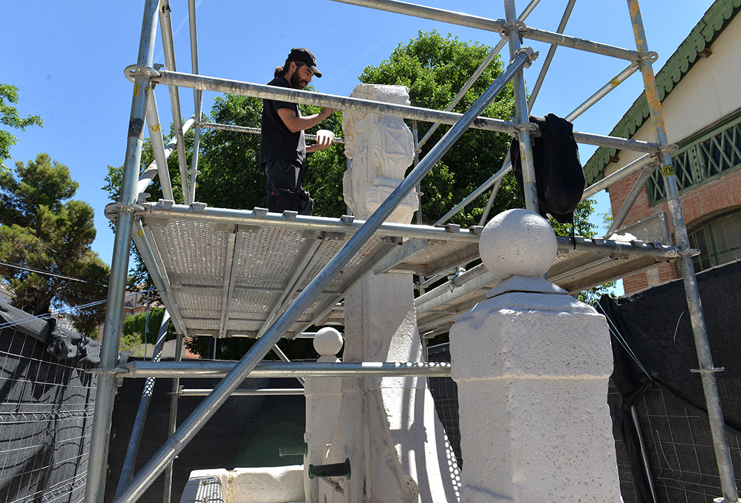 La intervención, con una inversión de más de 45.000 euros y a cargo de la Comunidad de Madrid, consiste en eliminar las causas del deterioro de la piedra colmenar y los elementos de hierro y bronce originales, reparar los daños de los materiales causados por el paso del tiempo y restituir la unidad estética del conjunto sin alterar su estructura.