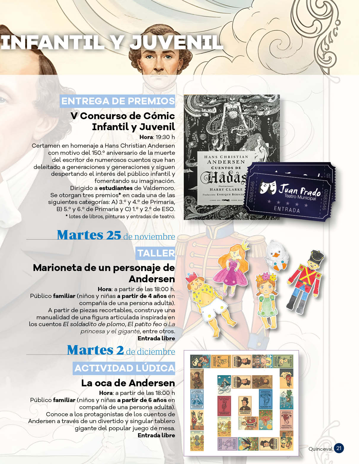 Del 21 de noviembre al 2 de diciembre, la Biblioteca Municipal Ana María Matute celebra la Semana del Libro Infantil y Juvenil que en su 37.ª edición homenajea a Hans Christian Andersen, coincidiendo con el 150.º aniversario de la muerte del escritor danés. Un taller, un actividad lúdica y la entrega de premios del concurso de cómic girarán en torno al universo del creador de títulos míticos de la literatura infantil como 'La sirenita', 'El soldadito de plomo' o 'El traje nuevo del emperador'. Estas jornadas de promoción de la lectura entre el público menudo coinciden con la exposición bibliográfica de novedades editoriales y un cuentacuentos.