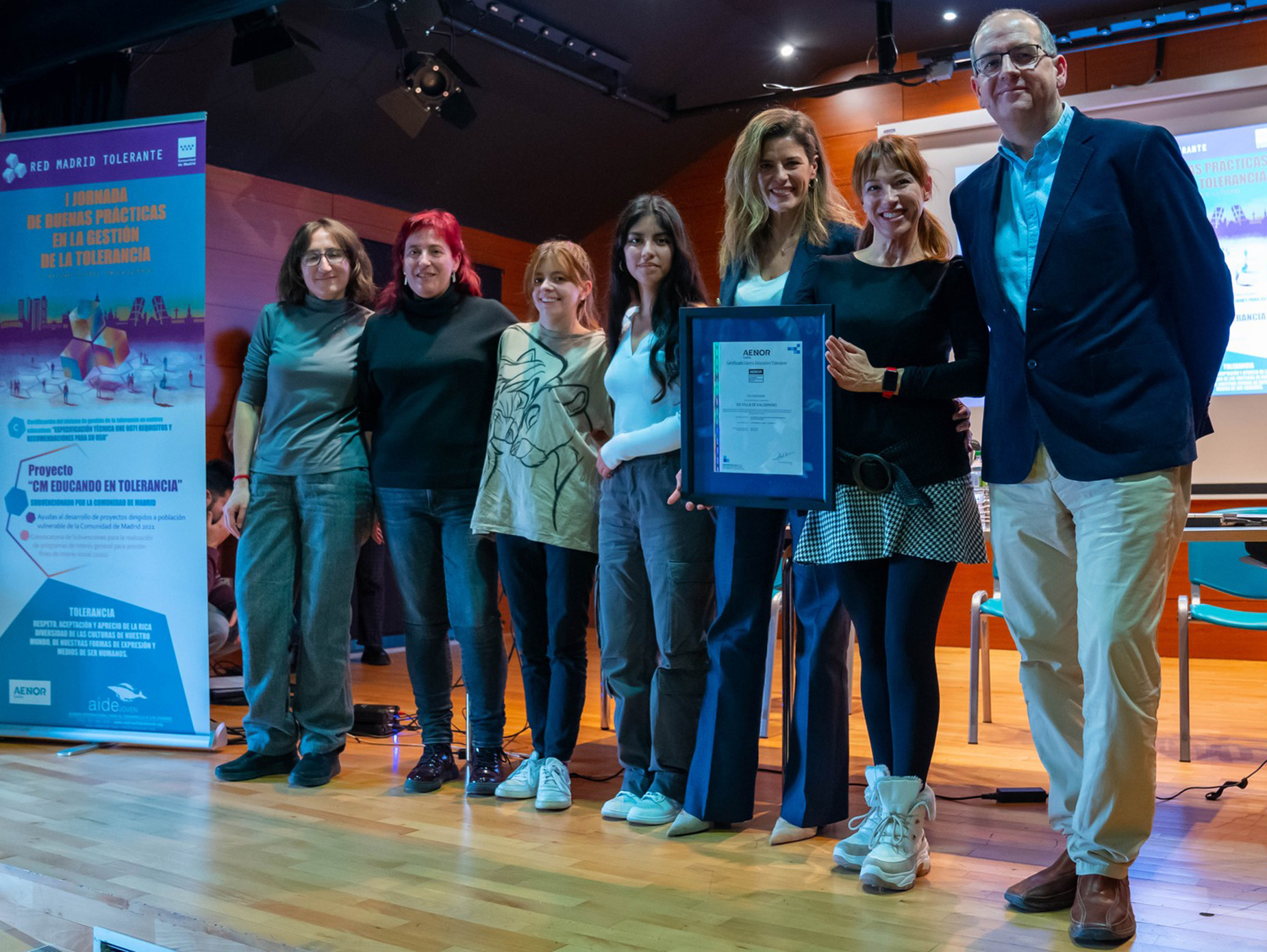 La entrega de este título al instituto de enseñanza secundaria más antiguo de la localidad tuvo lugar el pasado 26 de enero durante una jornada de buenas prácticas en la que el IES Villa de Valdemoro presentó iniciativas como el Punto Arcoíris, que conciencia sobre el respeto a la diversidad sexual, y el aula de Creativa, espacio de socialización del alumnado a partir de las manualidades. Los otros tres centros que han obtenido Certificados de Calidad en la Gestión de la Tolerancia Aenor han sido el CEIP 6 de Diciembre de Torrejón de Ardoz, el CEIP Giner de los Ríos de Parla y el IES Villablanca de Vicálvaro.