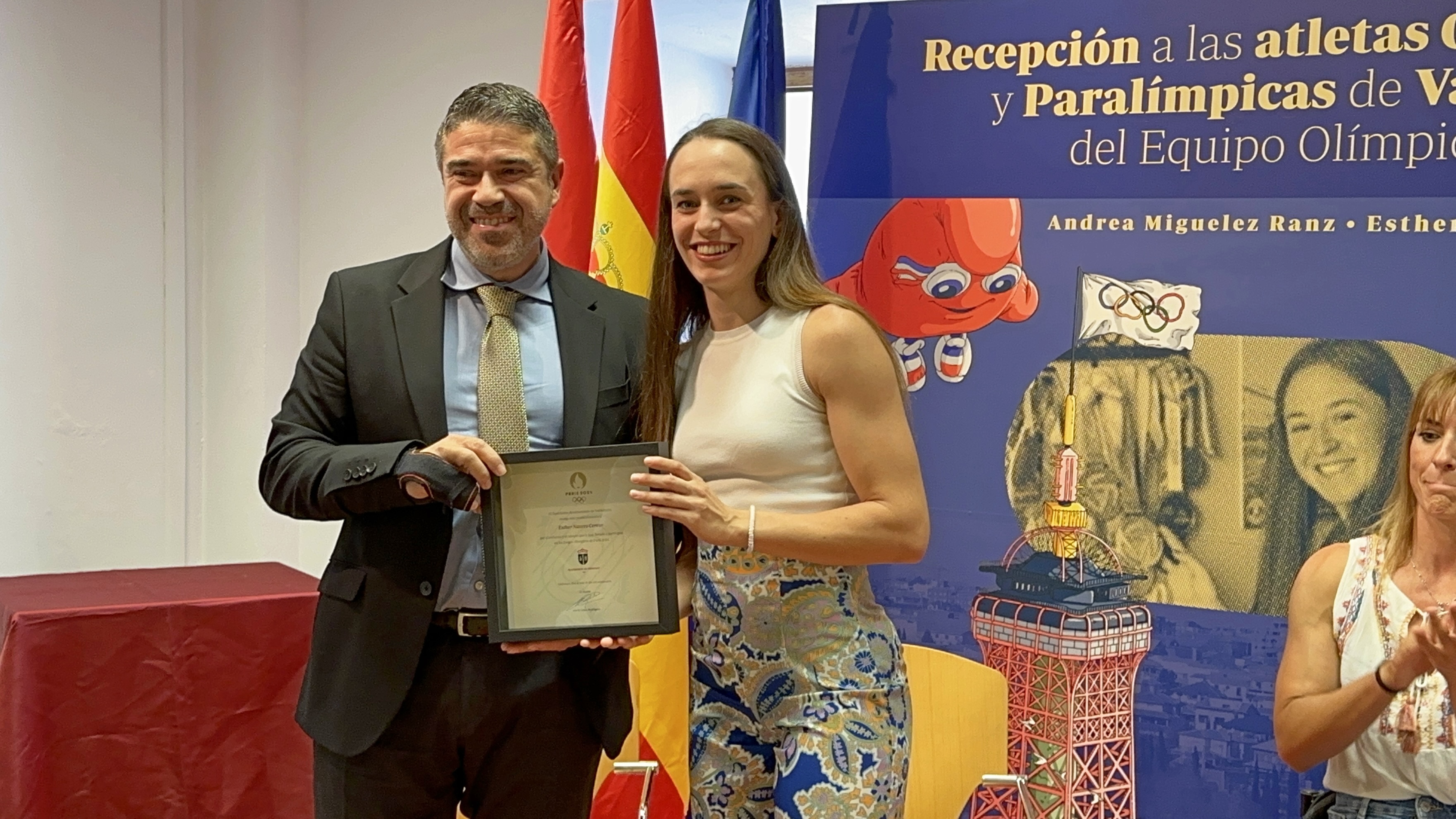 Esther Navero, especialista en carreras de velocidad, fue la primera en intervenir. Navero, una de las 58 atletas españolas (32 mujeres y 26 hombres) que participan en los Juegos Olímpicos de París 2024, relató que se sintió entre emocionada e incrédula. Del "no puede ser posible" y las lágrimas pasó a las felicitaciones de familiares y amistades y al actual "muy feliz". Ahora confiesa que solo le queda vivir la experiencia de formar parte del equipo que competirá en relevo 4x100 metros femenino, una prueba en la que hasta ahora nunca había participado España. Esther es de la cantera valdemoreña, ya que se inició en el club local Amigos del Atletismo aunque actualmente entrena en el club Playas de Castellón. A las puertas de cumplir 24 años, ha alcanzado numerosos méritos deportivos a nivel nacional e internacional. Ha sido cinco veces campeona de España, dos de ellas en pista cubierta. Internacionalmente debutó en el Campeonato Europeo de Atletismo de 2024, donde alcanzó el tercer puesto en relevo 4x100 metros.